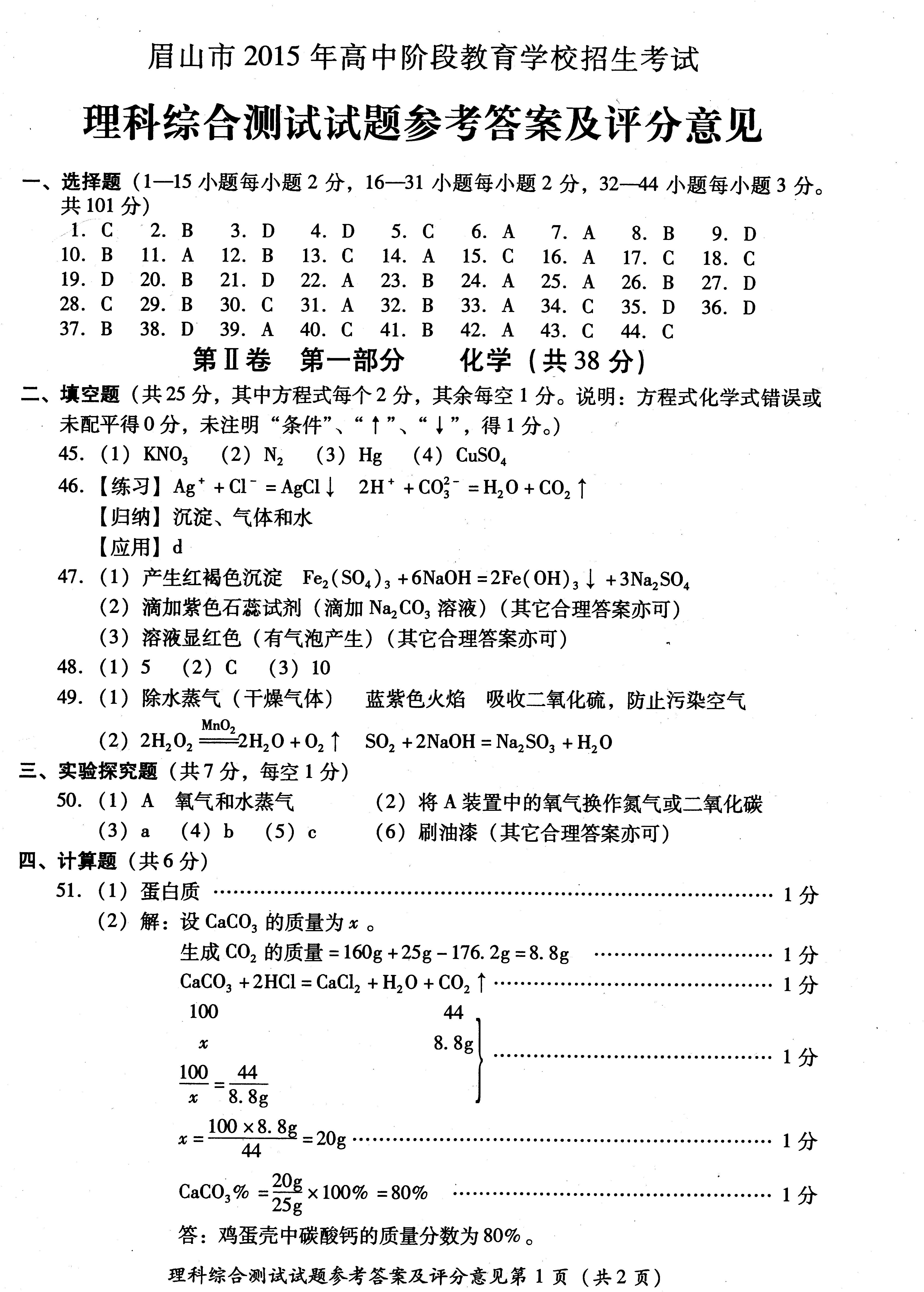 2024年四川眉山中考化学试题及答案