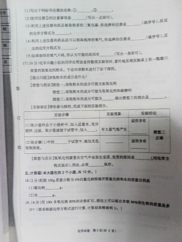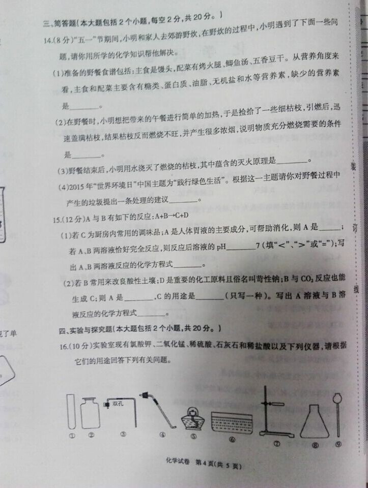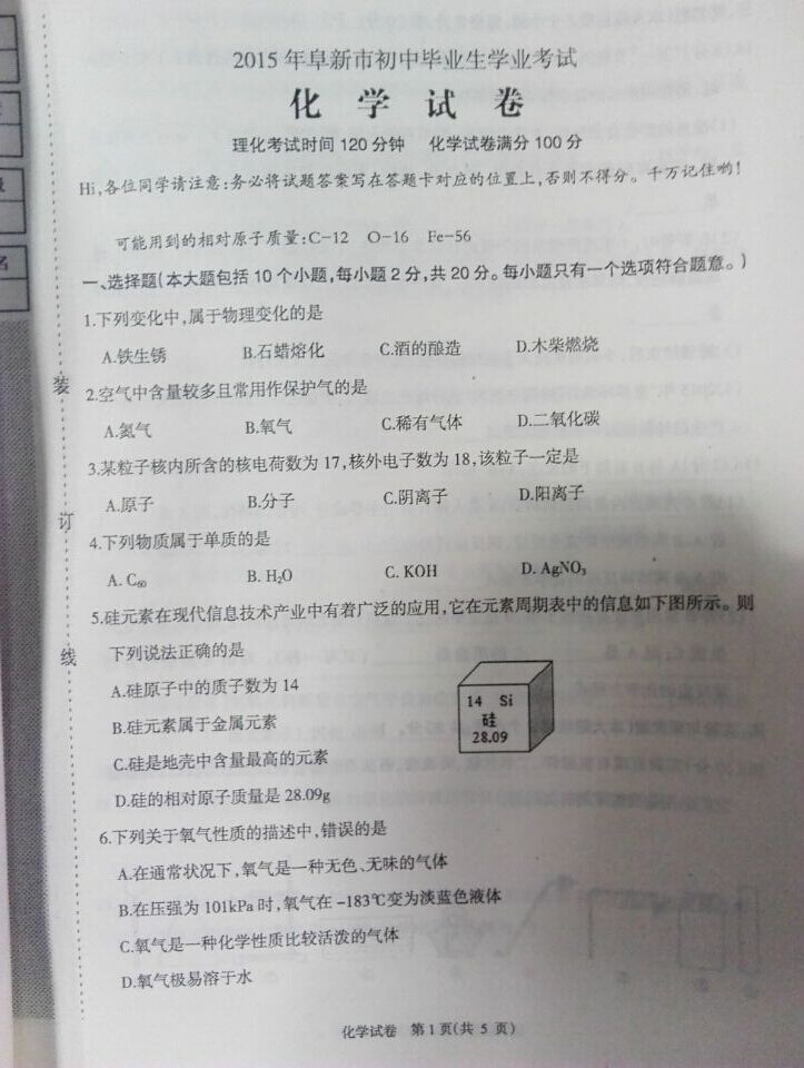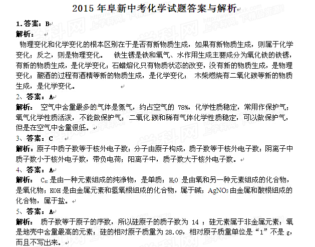 2015年辽宁阜新中考化学试卷及答案(完整版)