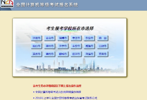 考生登陆“山东省教育招生考试院”官方网站www.sdzk.cn,选择“全国计算机等级考试报名”栏目,打开主页面,选择所要报考的考点学校所属市后进行网上报名。如下图所示。