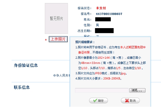 六、考生信息填写完毕后,上传照片(照片必须符合规格要求,下图所示)。
