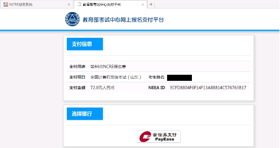 十、考生在弹出的“教育部考试中心网上报名支付平台”页面选择银行支付(如果没有弹出支付页面,需要设置本地浏览器,允许弹出页面。)
