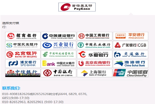 十一、点击上图所示“首信易支付”按钮,选择支付银行(下图所示)。