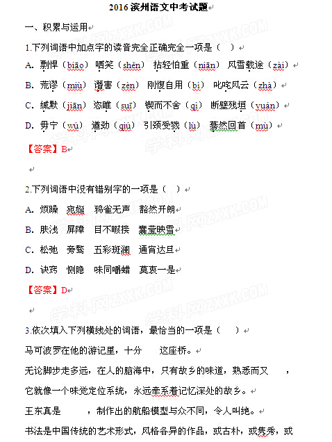 2016年山东滨州中考语文试卷及答案(已公布)