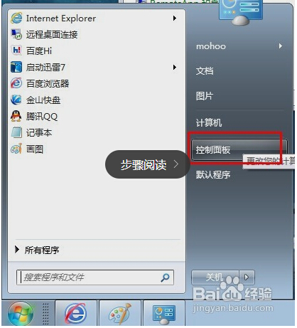 1、打开开始菜单,选择控制面板。