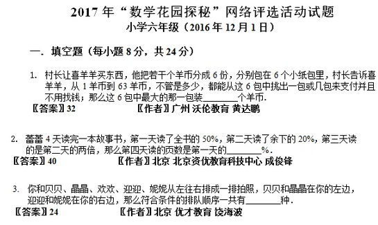 2017年数学花园探秘网赛迎春杯试题(六年级)