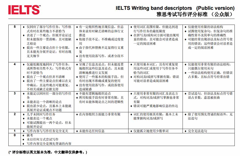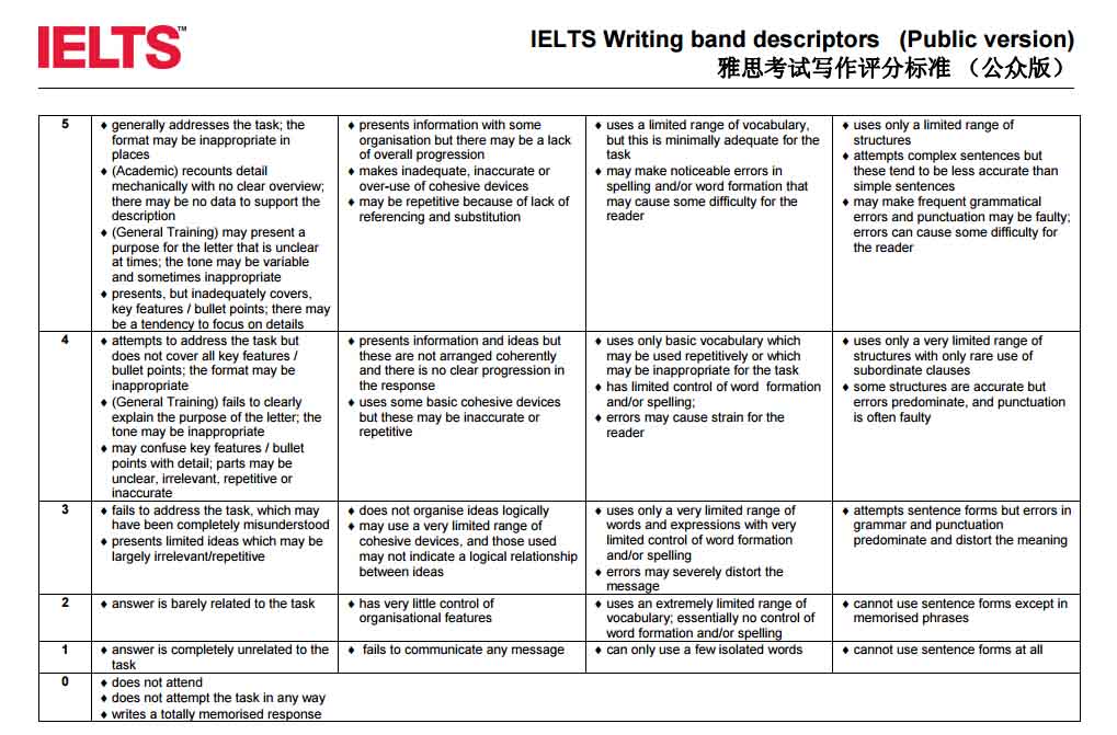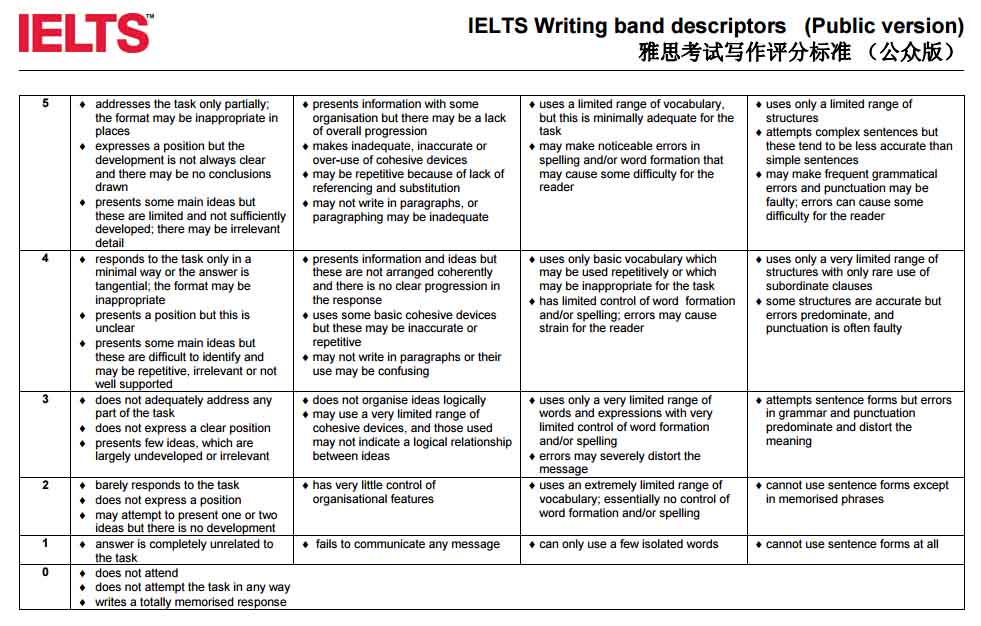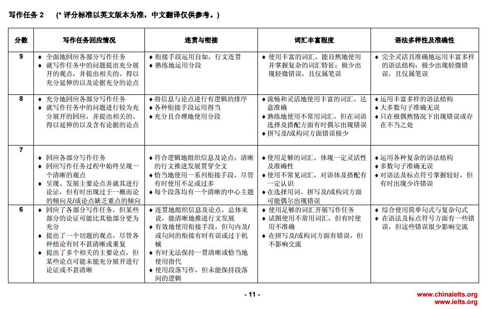Task 2: 写作任务回应情况、连贯与衔接、词汇丰富程度、语法多样性及准确性。