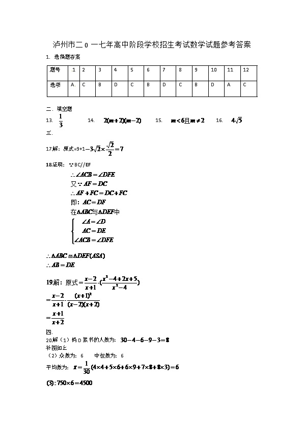 2017年四川泸州中考数学答案(已公布).docx
