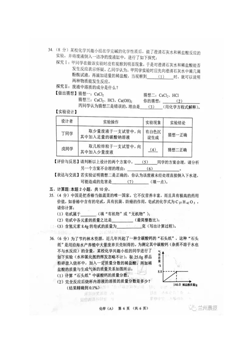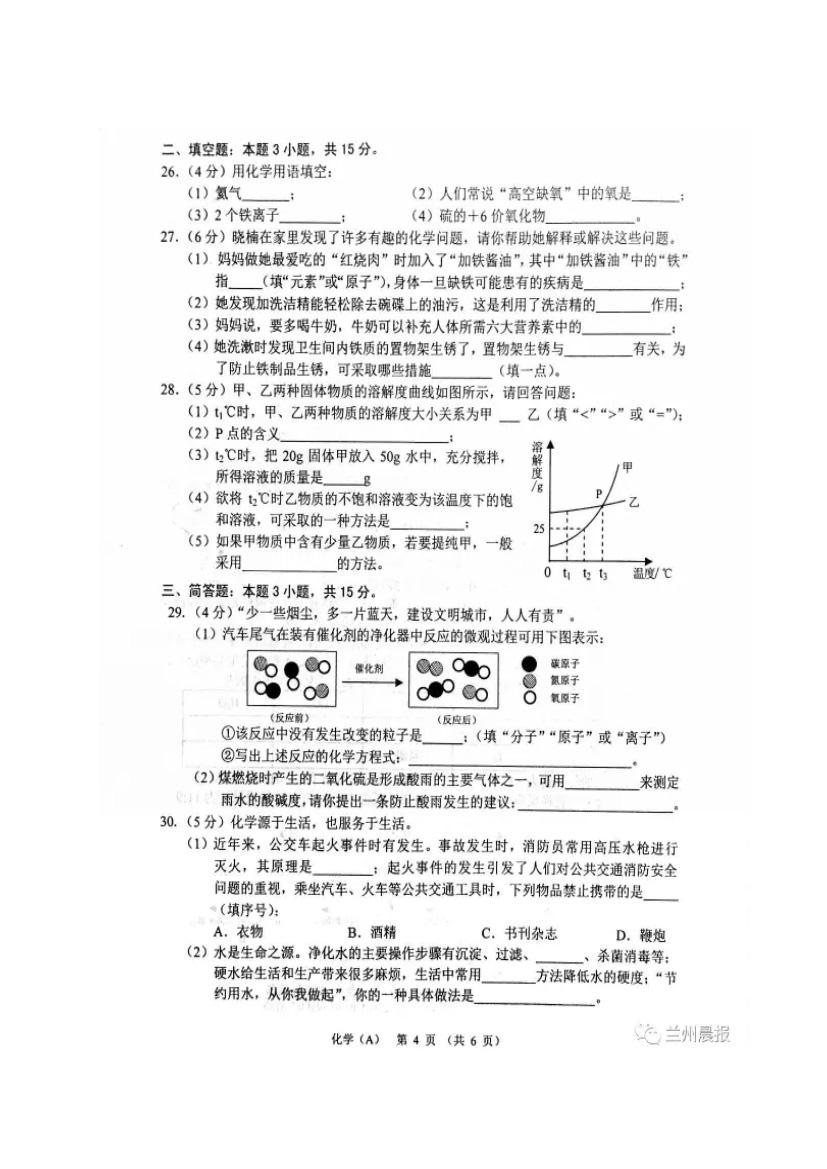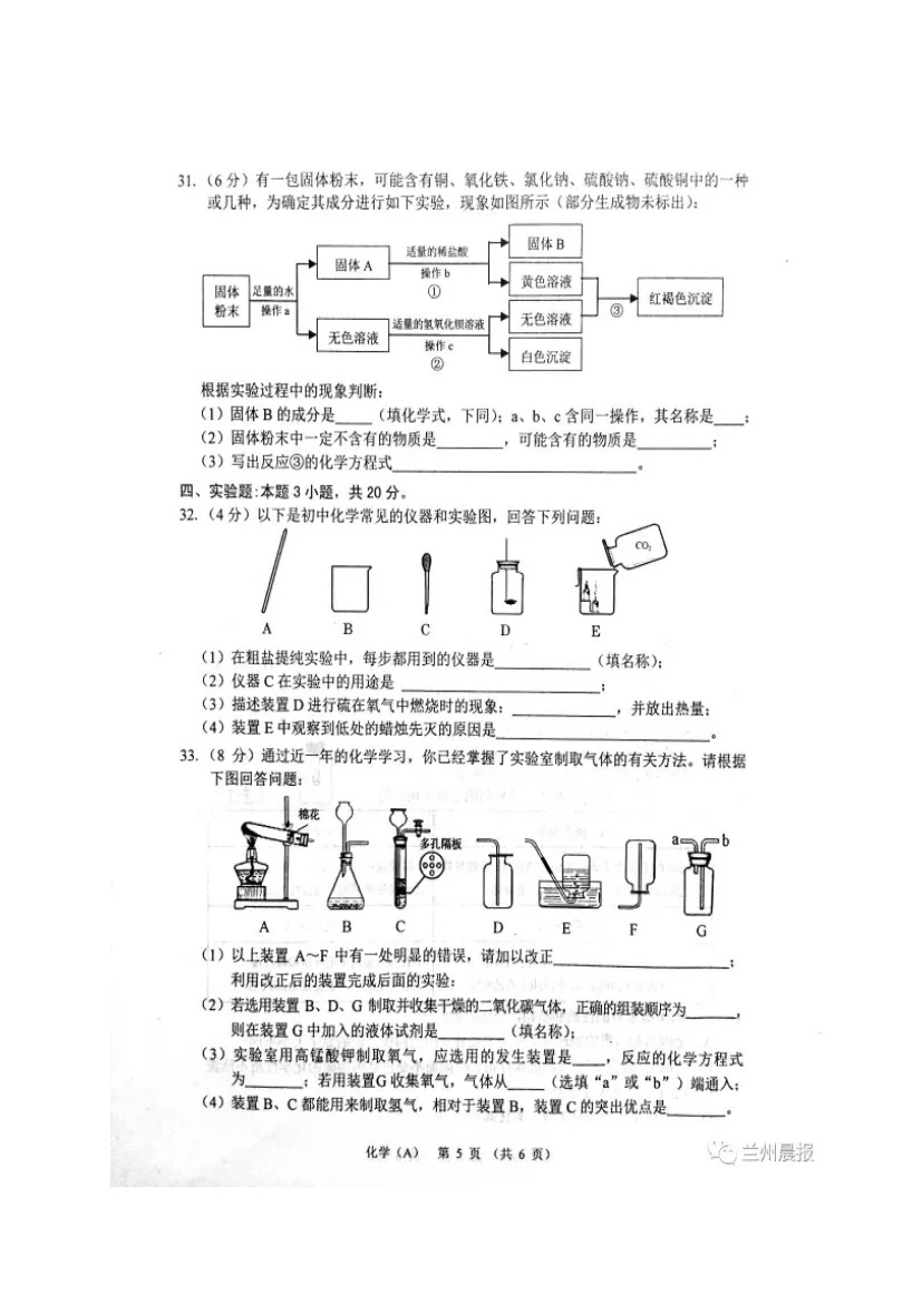 人生处处是考场,今日各为中考忙。斗智斗勇齐亮相,得失成败走一场。考场潇洒不虚枉,多年以后话沧桑!2017年甘肃兰州中考化学科目考试已落下帷幕,®无忧考网在考后第一时间提供甘肃兰州中考化学试卷及答案解析,供广大考生参考估分。预祝各位考生取得优异的成绩,顺利考入理想的高中!