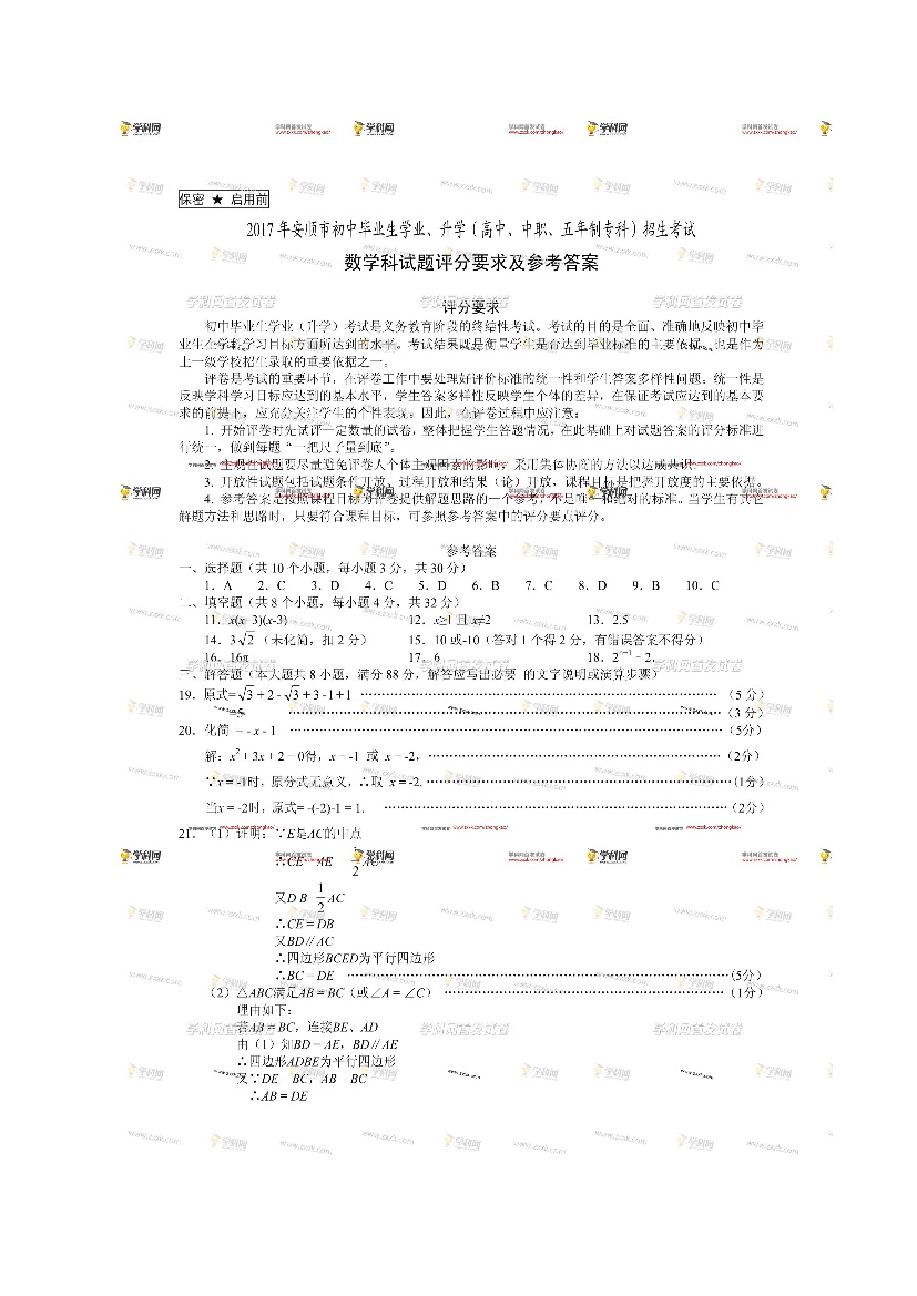 人生处处是考场,今日各为中考忙。斗智斗勇齐亮相,得失成败走一场。考场潇洒不虚枉,多年以后话沧桑!2017年贵州安顺中考数学科目考试已落下帷幕,®无忧考网在考后第一时间提供贵州安顺中考数学试卷及答案解析,供广大考生参考估分。预祝各位考生取得优异的成绩,顺利考入理想的高中!