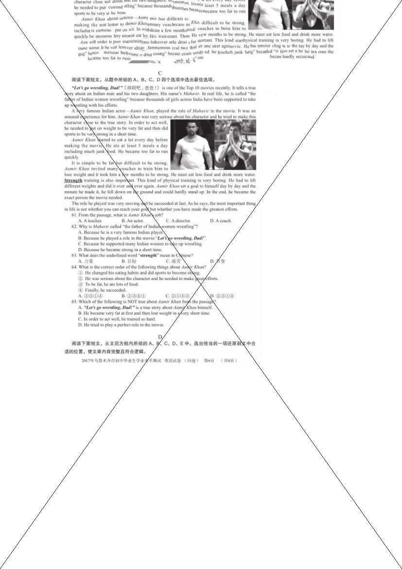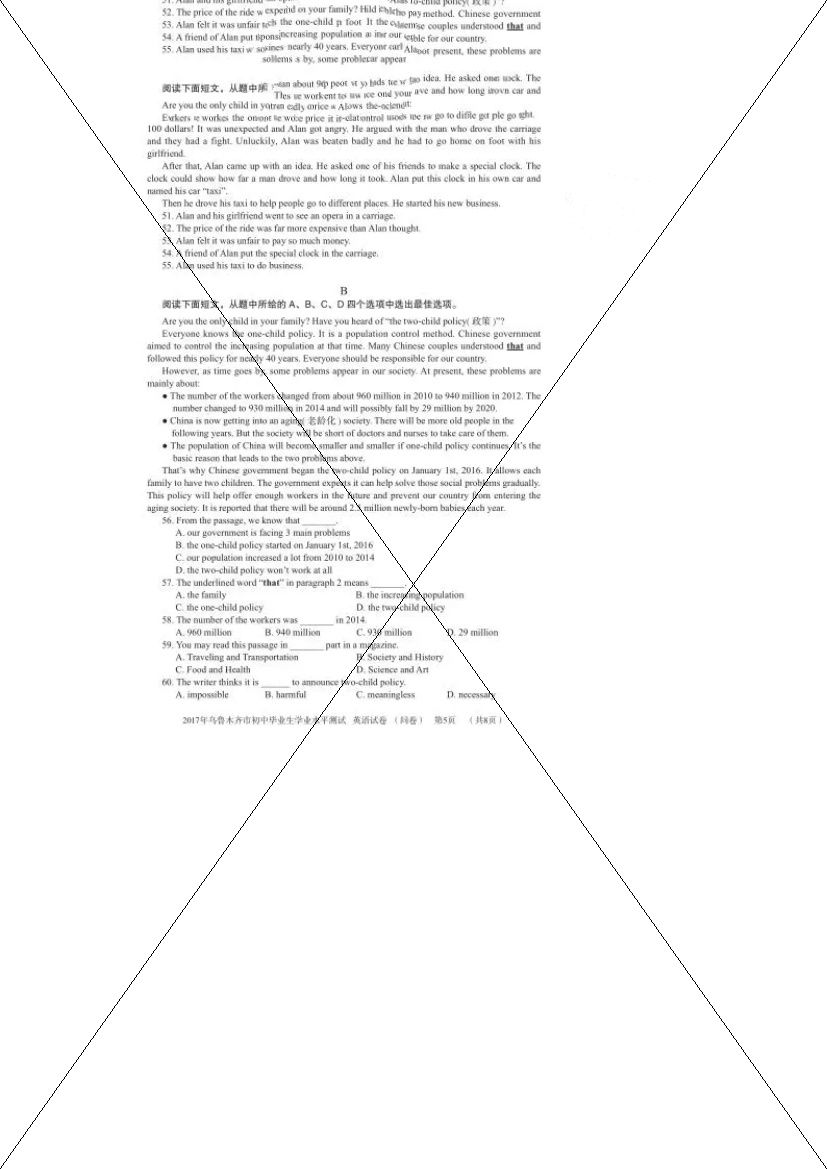 人生处处是考场,今日各为中考忙。斗智斗勇齐亮相,得失成败走一场。考场潇洒不虚枉,多年以后话沧桑!2017年新疆乌鲁木齐中考英语科目考试已落下帷幕,©无忧考网在考后第一时间提供新疆乌鲁木齐中考英语试卷及答案解析,供广大考生参考估分。预祝各位考生取得优异的成绩,顺利考入理想的高中!