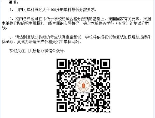 无忧考网考研频道从四川大学了解到,四川大学2019年考研复试分数线已公布,具体如下: