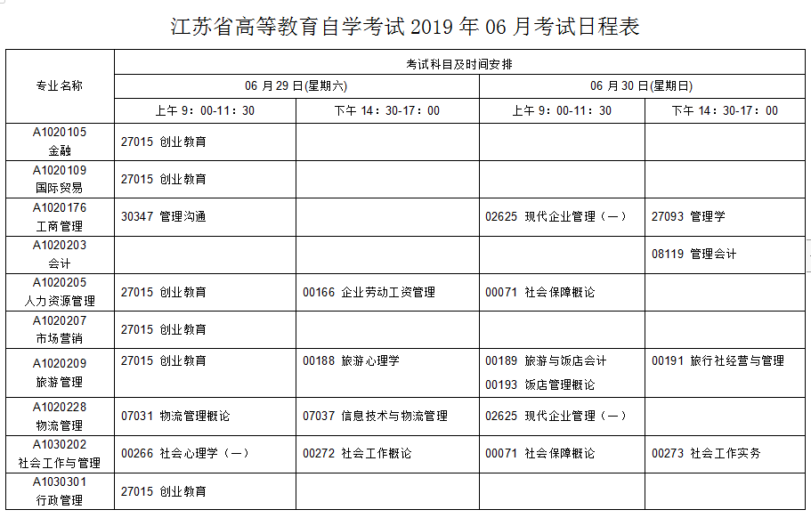 江苏省高等教育自学考试2019年06月考试日程表.doc