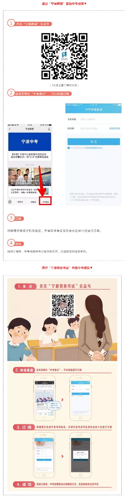 浙江宁波各区县2019年中考成绩查询时间为6月21日16时,考生可直接进入“宁波市教育局”网站首页(http://www.nbedu.gov.cn)输入考生准考证号和查询码进行查分。或者通过“宁波教育”“宁波教育考试”微 信 公 众 号、宁波智慧教育APP、宁波市民通APP、114、12580查询。