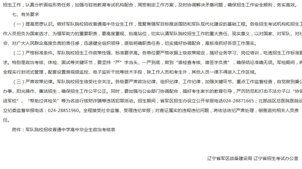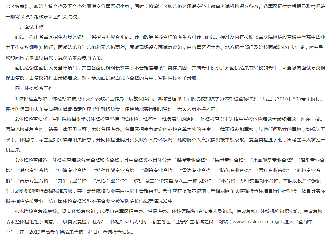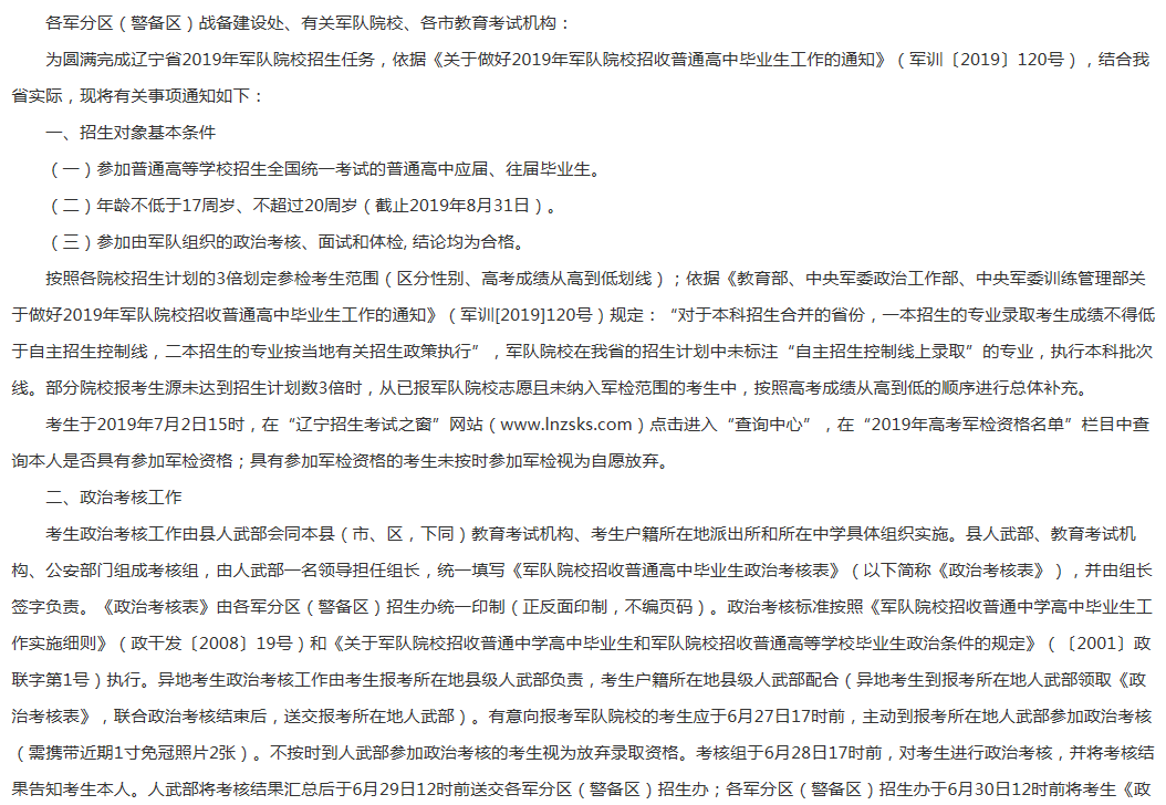 忧考网高考频道了解到,辽宁省招生考试之窗发布了《2019年军校招收普通高中毕业生工作通知》,具体情况如下:
