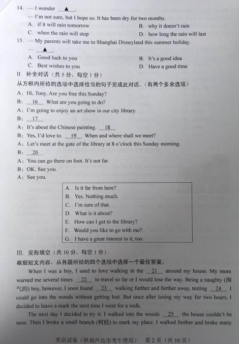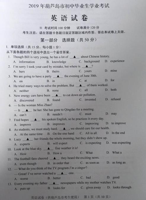 【#中考# #2019年辽宁葫芦岛中考英语试卷(已公布)#】2019年辽宁葫芦岛中考英语考试已结束,©无忧考网中考频道搜集整理发布了“2019年辽宁葫芦岛中考英语试卷”,供考生们参考学习,小编预祝大家取得优异的成绩!
