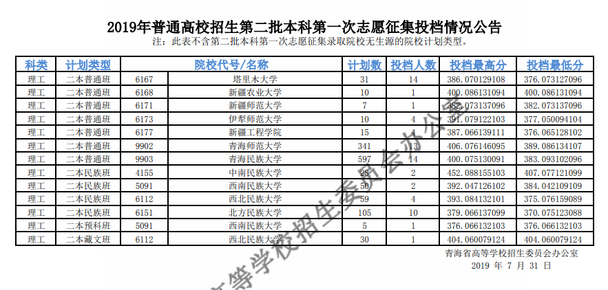 2019年青海普通高校招生第二批本科第一次志愿征集投档情况公告