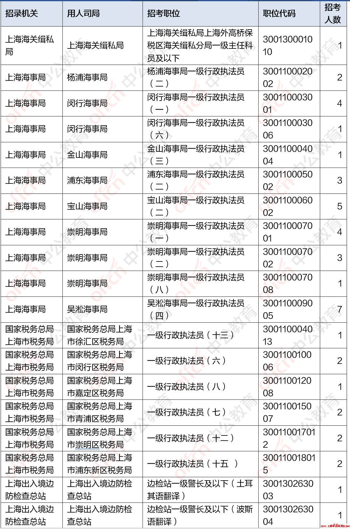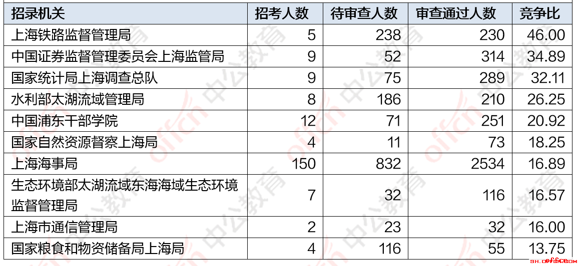 截止到18日9时,竞争比例的职位为上海海事局浦东海事局一级行政执法员职位,招录1人,截止到18日9时审核通过人数为321人。报名通过审核人数前十的职位主要集中在上海海事局,上海铁路监督管理局等部门。