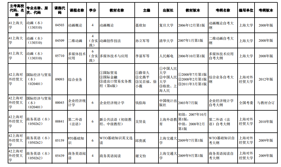 2026年4月上海市高等教育自学考试教材考纲书目表