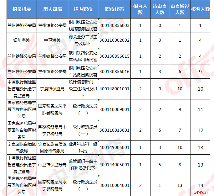 截至10月22日16时,据统计,国考职位中工作地点在宁夏的职位报名总人数为5028人,审查通过4231人,报名竞争比达168:1。