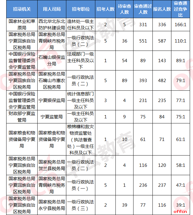 截至10月22日16时,审查通过竞争比排名前十的招录机关主要集中在西北华北东北防护林建设局、国家税务总局青铜峡市税务局、石嘴山银保监分局,其中目前审查通过竞争比达到166:1