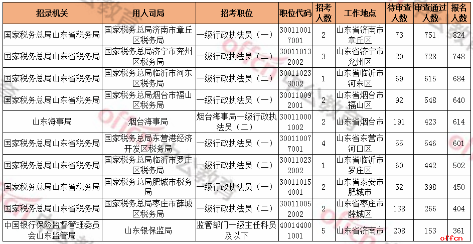 报名人数前十的职位主要集中在国家税务总局山东省税务局、山东海事局、中国银行保险监督管理委员会山东监管局,具体信息如下: