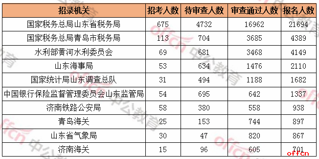 截止到23日9时,报名人数前三位的部门依次是:国家税务总局山东省税务局、国家税务总局青岛市税务局、水利部黄河水利委员。三部门报名人数为30232人,占报名总人数的75.62%。