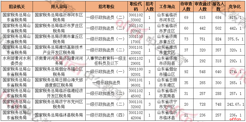 目前,竞争比例较高的岗位是国家税务总局山东省税务局国家税务总局临沂市河东区税务局一级行政执法员(二)一职。该岗位招录1人,审核通过人数为615人,竞争比达615:1。