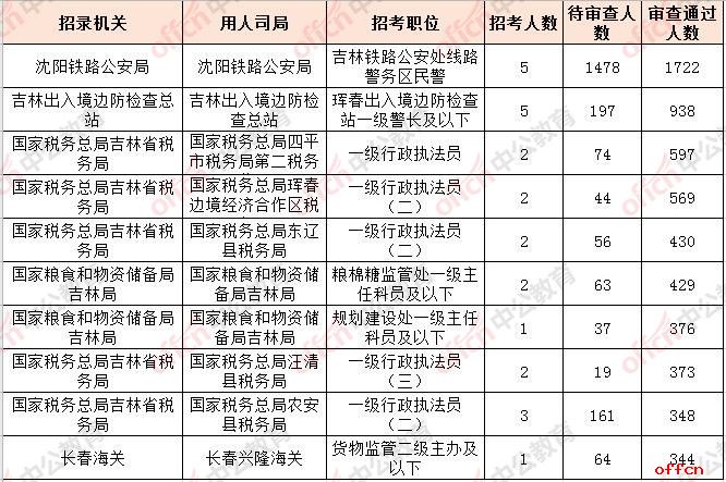 截至24日9时,通过审核的职位人数最多的为沈阳铁路公安局吉林铁路公安处线路警务区民警职位,招录5人,审核通过1722人,其次是吉林出入境边防检查总站珲春出入境边防检查站一级警长及以下岗位。报名人数前十的职位主要集中在沈阳铁路公安局、国家税务总局吉林省税务局、国家粮食和物资储备局吉林局等部门,具体信息如下: