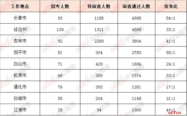 2020年国考公告已于10月14日发布,本次考试吉林省共设岗位324个,计划招收650人,截至10月24日9时,据统计,国考职位中工作地点在吉林省的职位共报名29257人,其中通过审核总人数为22800人,待审查人数共有6457人。