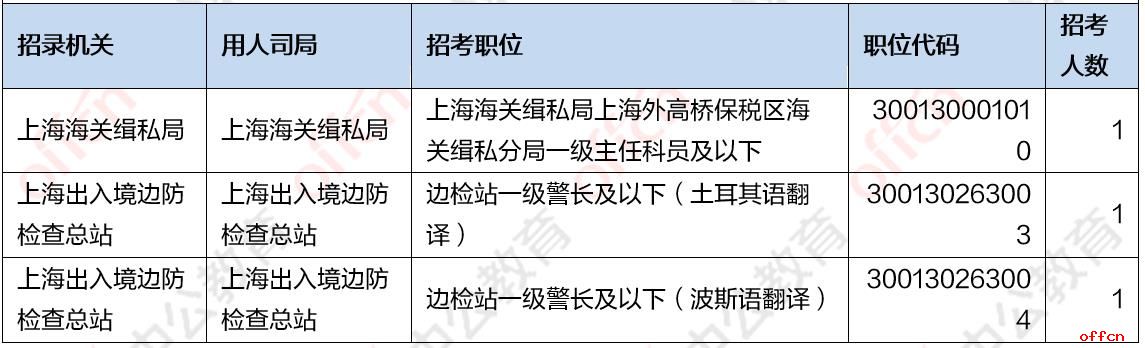截止到24日9时,工作地点在上海的职位共有3个无人报考,占全部职位的0.01%。下面是无人报考职位一览表,专家建议广大考生多关注一些较冷职位,避免激烈竞争,结合自身条件,找到属于自己的职位。