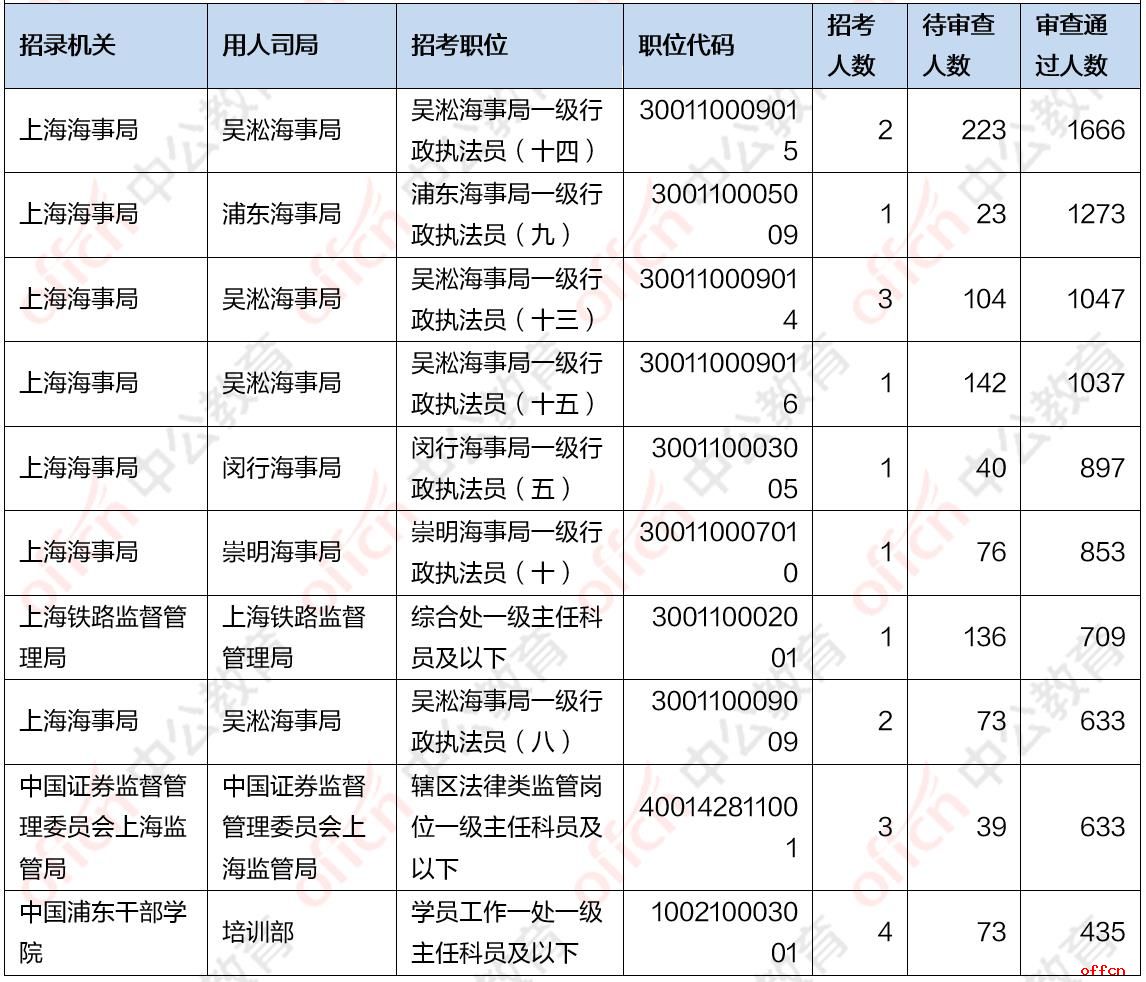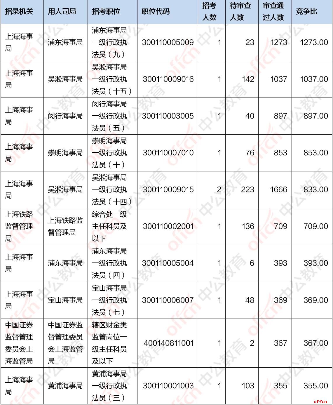 截止到24日9时,竞争比例的职位为上海海事局浦东海事局一级行政执法员职位,招录1人,截止到24日9时审核通过人数为1273人。报名通过审核人数前十的职位主要集中在上海海事局,上海铁路监督管理局等部门,具体信息如下: