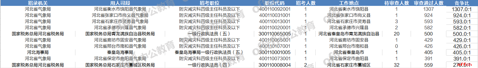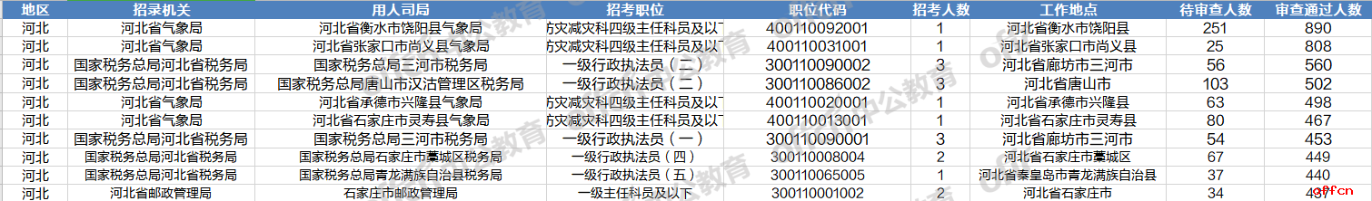 报名通过审核人数前十的职位主要集中在河北省气象局、国家税务总局河北省税务局,具体信息如下: