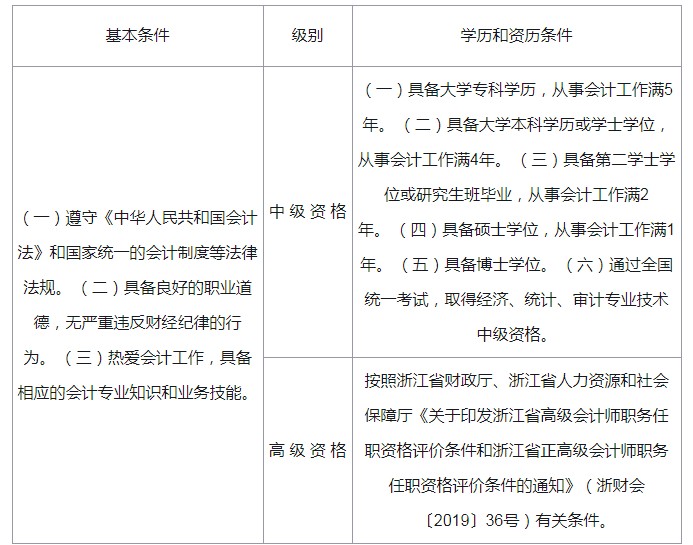 参加浙江省高级会计师职务任职资格评审的人员,必须符合浙江省财政厅、浙江省人力资源和社会保障厅《关于印发浙江省高级会计师职务任职资格评价条件和浙江省正高级会计师职务任职资格评价条件的通知》(浙财会〔2019〕36号)规定的评审申报条件。