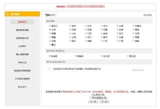 每个省份都有区域选择,是根据住宅所在地来选择区域,以方便中注协将考生分配到离家较近的考场。之后记得把下边的"我已阅读公告"勾上。