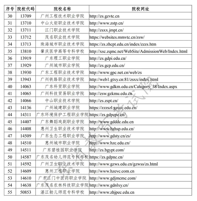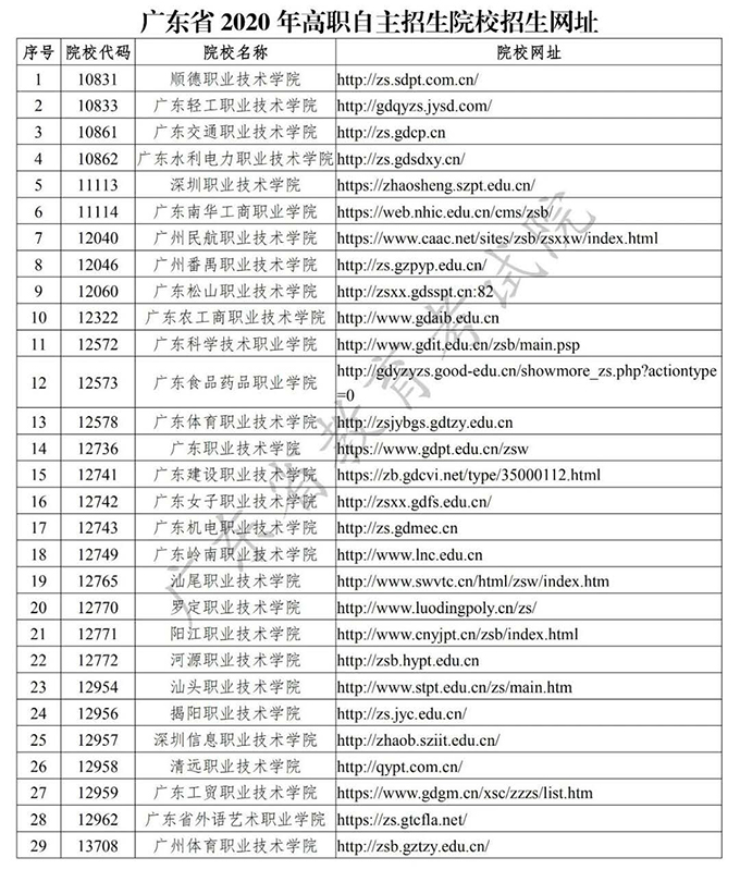 表三:广东省2020年高职自主招生院校(面向高中生)招生网址