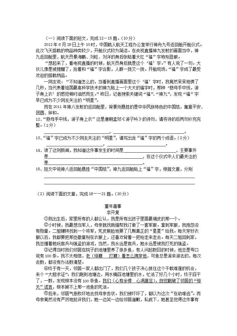 【文档名称】 2012年重庆巴中小升初新生入学语文真题(Word版).doc