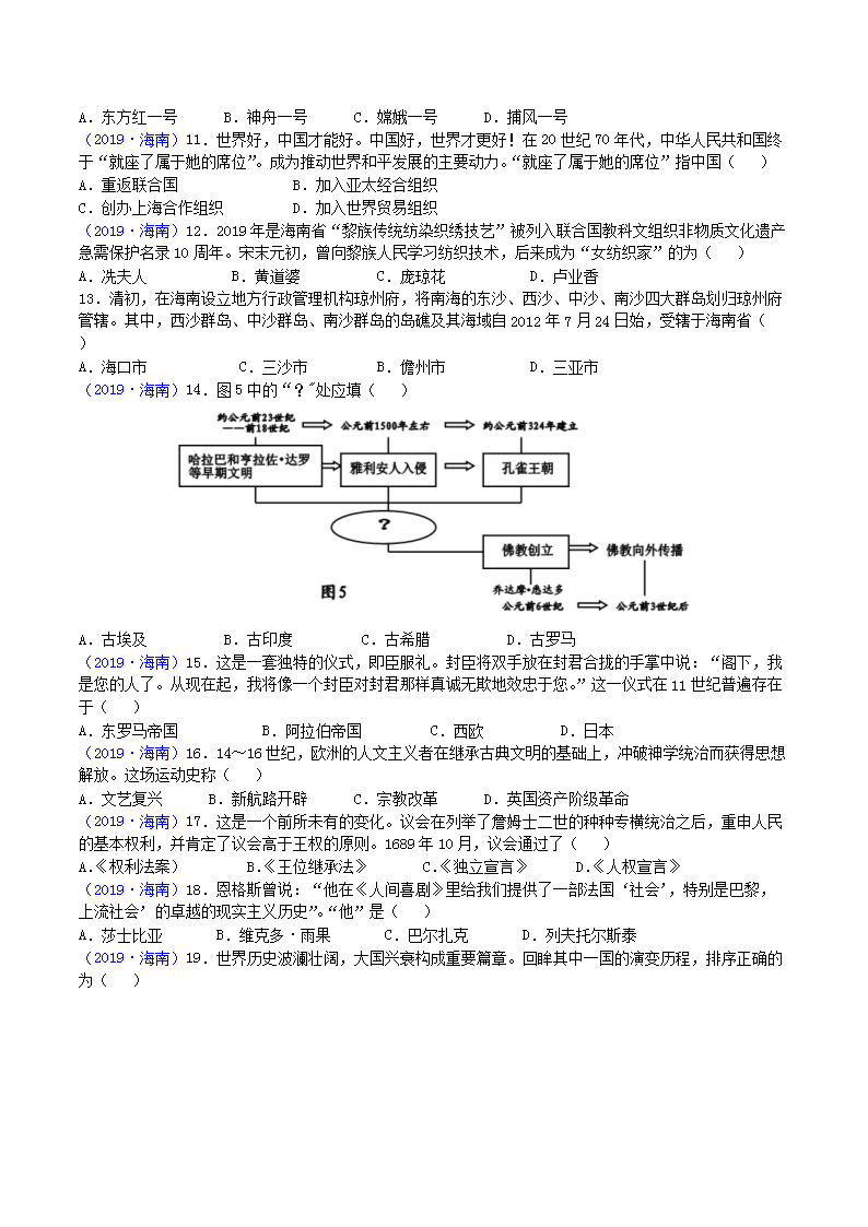 【文档名称】 2019年海南省中考历史真题及答案(Word版).doc