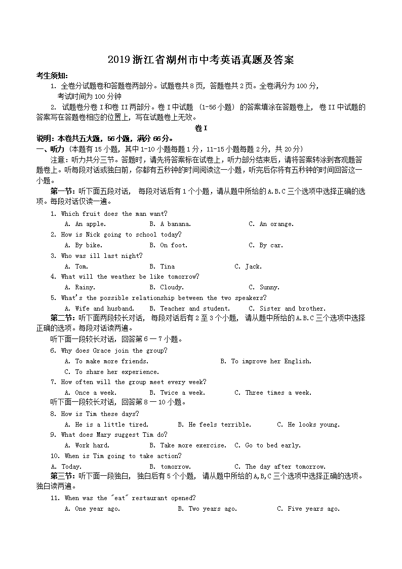 【文档名称】 2019浙江省湖州市中考英语真题及答案(Word版).doc