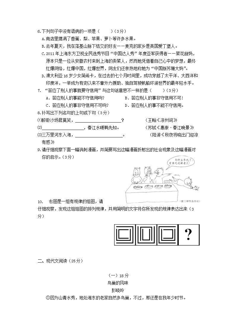 【文档名称】 2018年福建小升初语文考试真题(Word版).doc