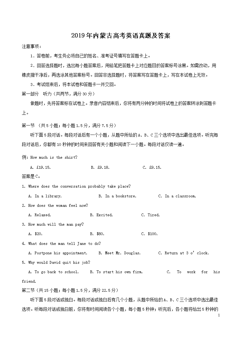 【文档名称】 2019年内蒙古高考英语真题及答案(Word版).doc