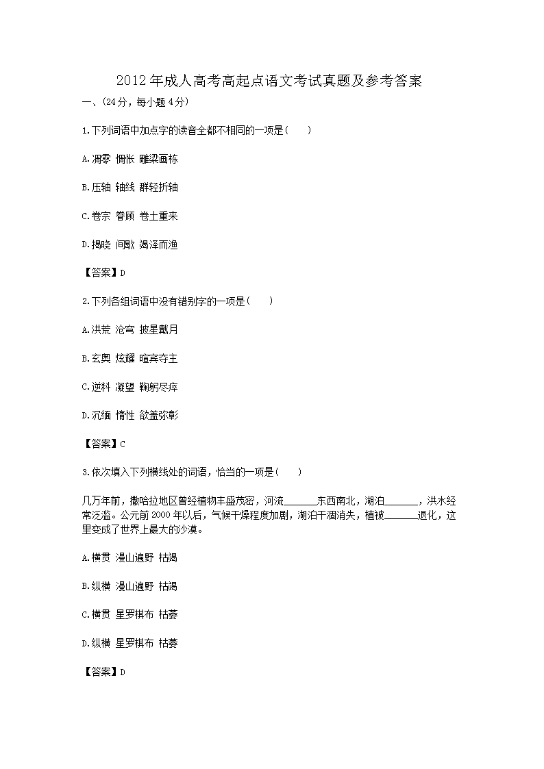 【文档名称】 2012年成人高考高起点语文考试真题及参考答案(Word版).doc