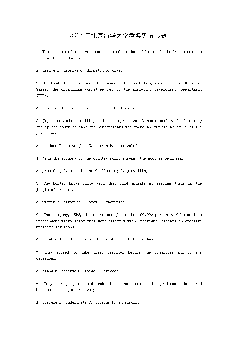 【文档名称】 2017年北京清华大学考博英语真题(Word版).doc