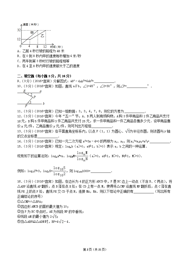 【文档名称】 2016年四川省宜宾市中考数学真题及答案(Word版).doc
