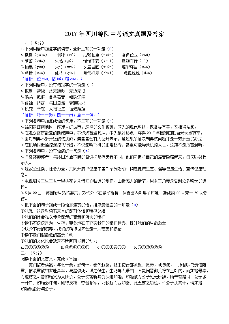 【文档名称】 2017年四川绵阳中考语文真题及答案(Word版).doc
