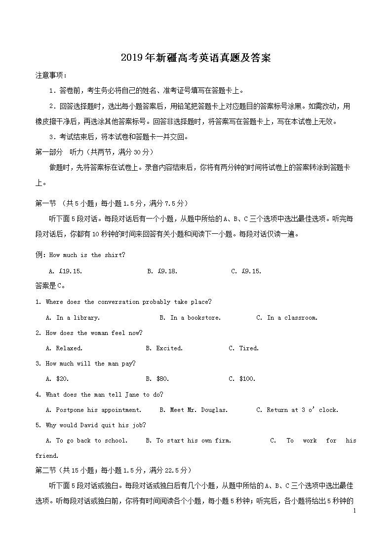 【文档预览】 无忧考网整理发布2019年新疆高考英语真题及答案(Word版),前五页预览如下: