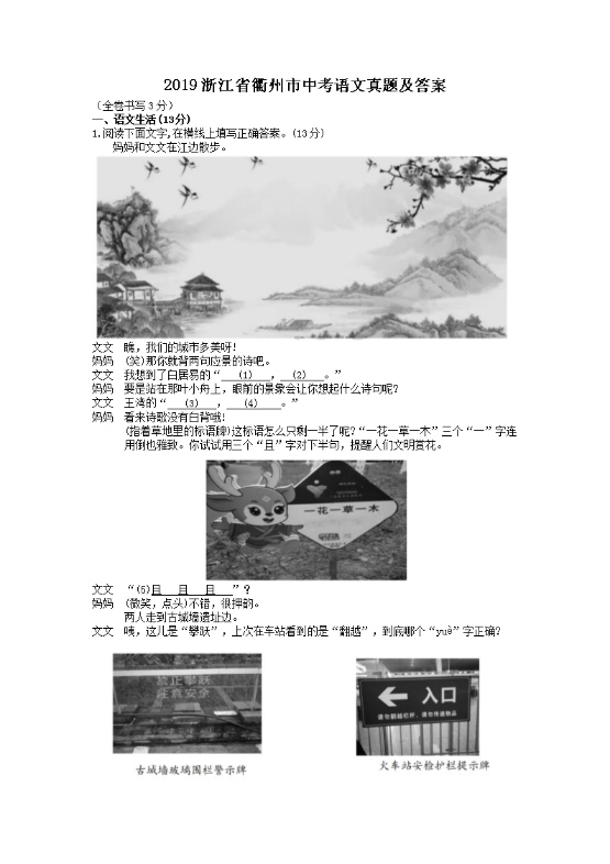 【文档名称】 2019浙江省衢州市中考语文真题及答案(Word版).doc