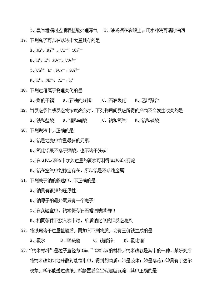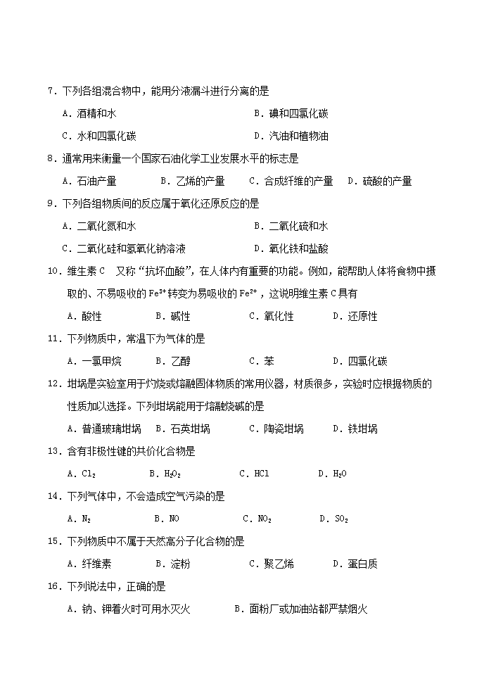【文档名称】 2016天津普通高中化学考试真题及答案(Word版).doc