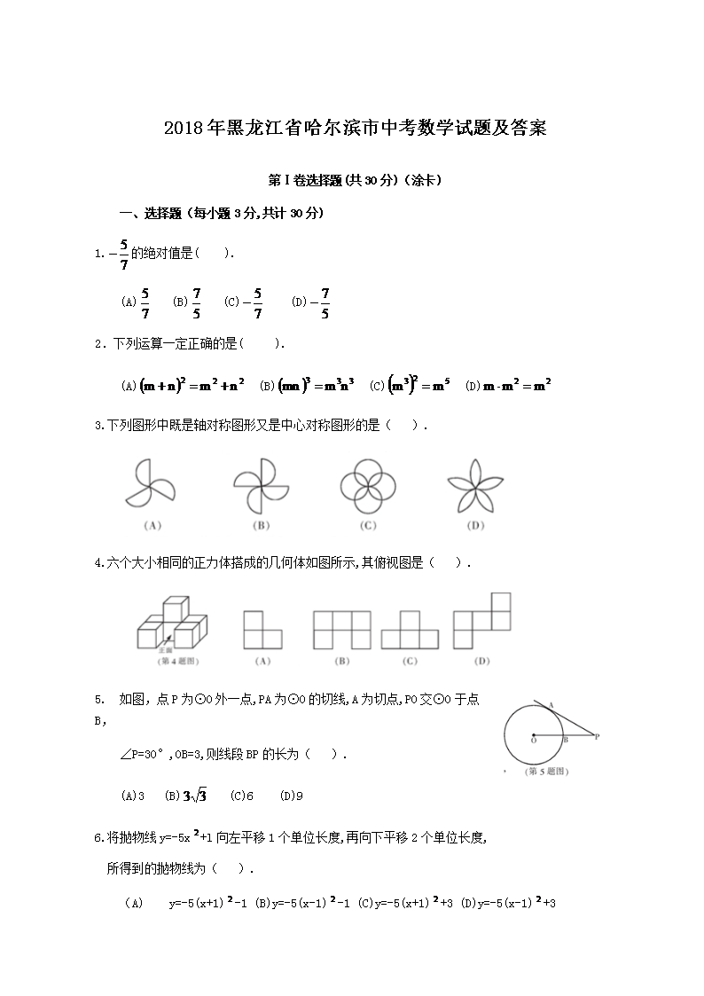 【文档名称】 2018年黑龙江省哈尔滨市中考数学试题及答案(Word版).doc