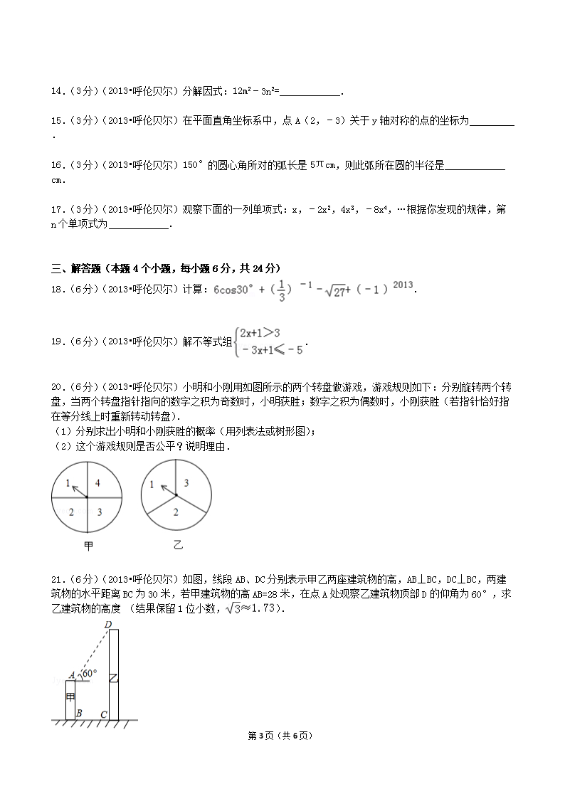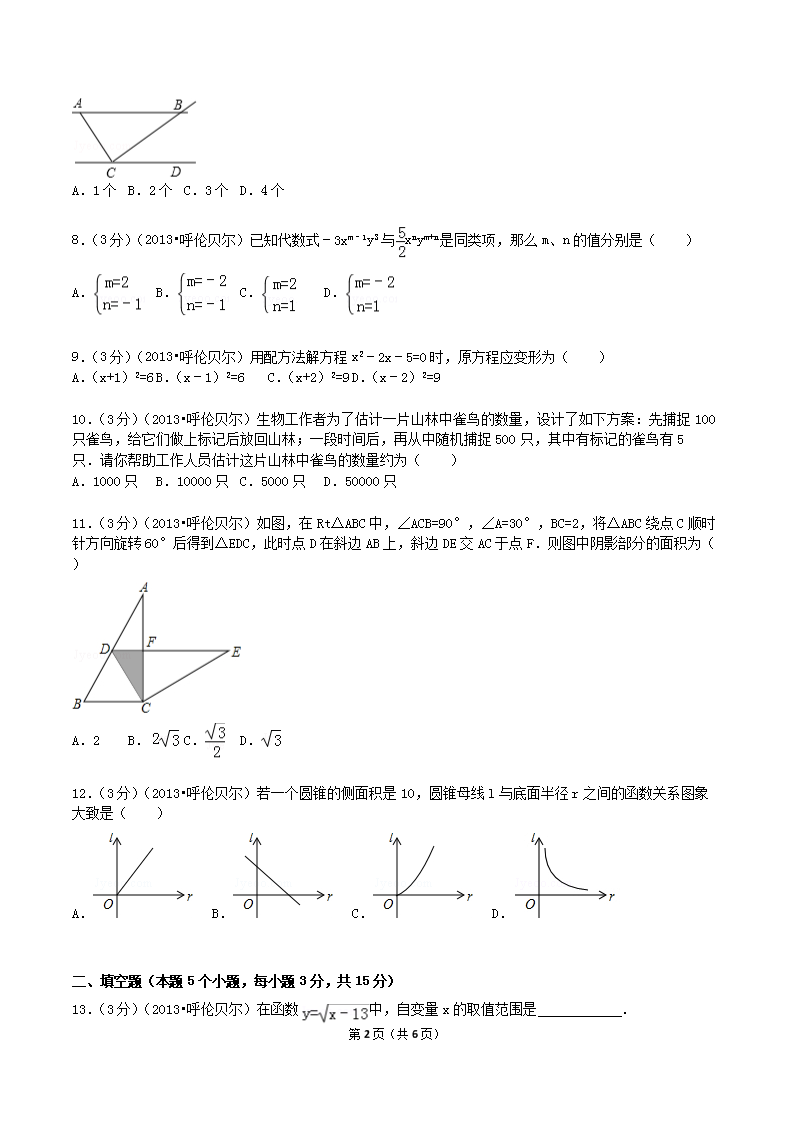 【文档名称】 2013年内蒙古呼伦贝尔市中考数学真题及答案(Word版).doc