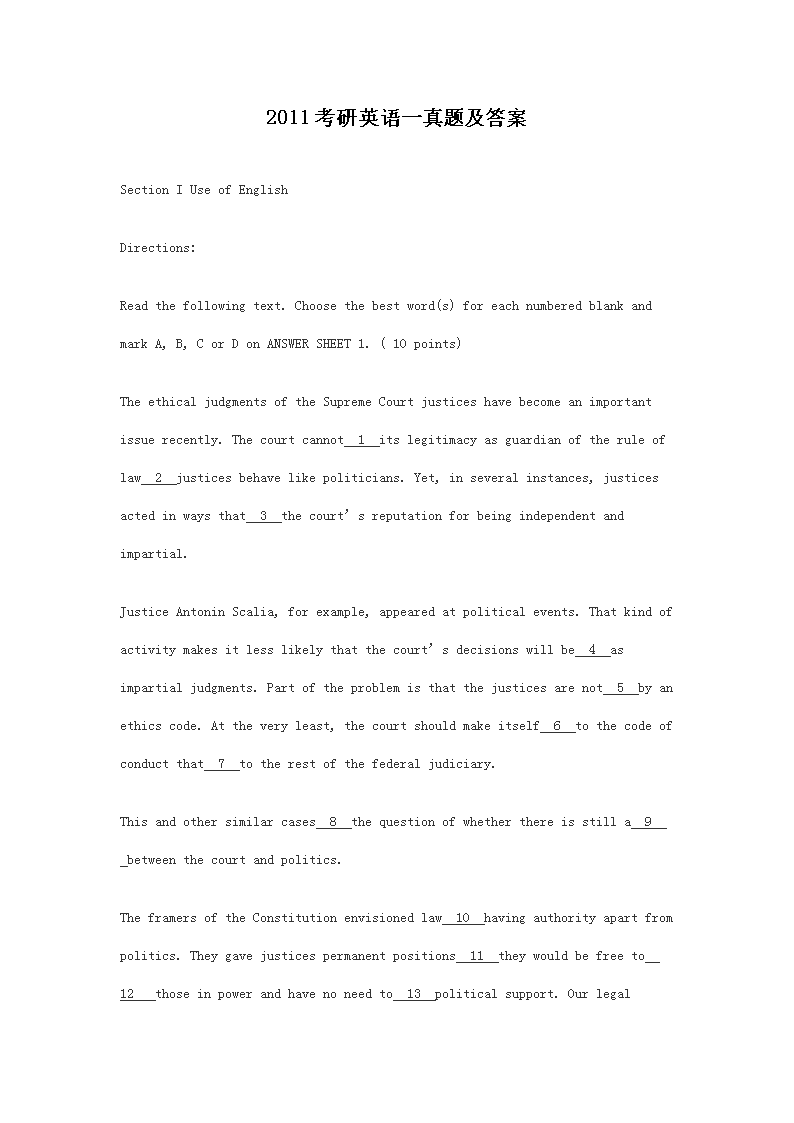 【文档名称】 2011考研英语一真题及答案(Word版).doc